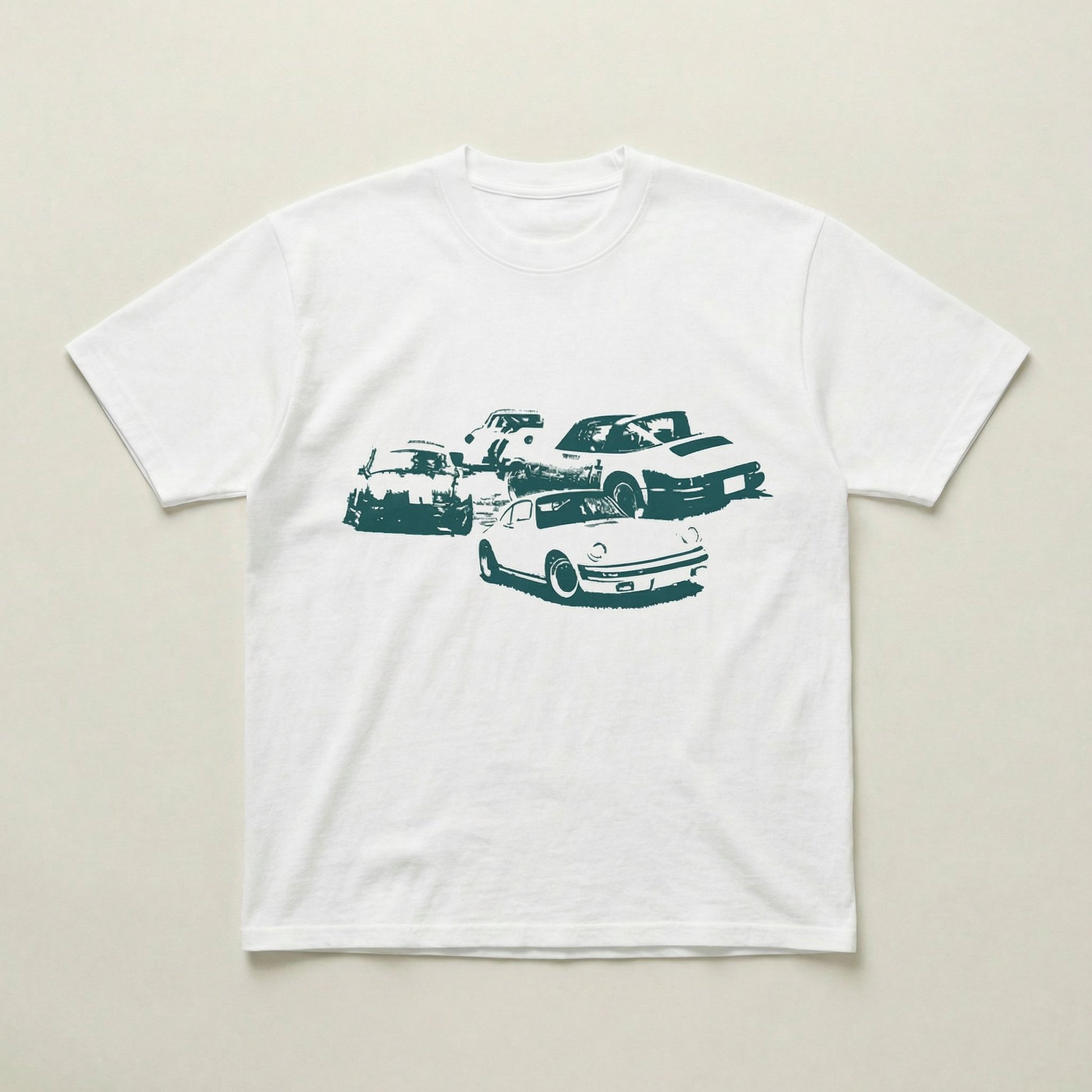 White and green cars graphic tee