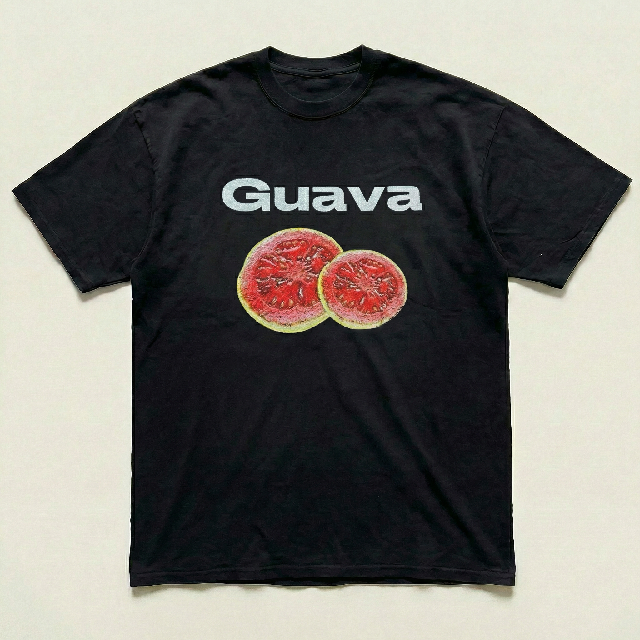 Black Guava Tee Make a fruity statement with this Black Guava tee. Showcasing vibrant guava-inspired graphics on a sleek black canvas, this shirt celebrates tropical flavors and bold design. Constructed from premium cotton, it delivers softness and durability for everyday wear. Whether you're a fruit enthusiast, nature lover, or simply drawn to distinctive artwork, this tee adds character to your collection. Effortlessly versatile, it pairs well with shorts, joggers, or layered pieces for a look that's both comfortable and visually striking.