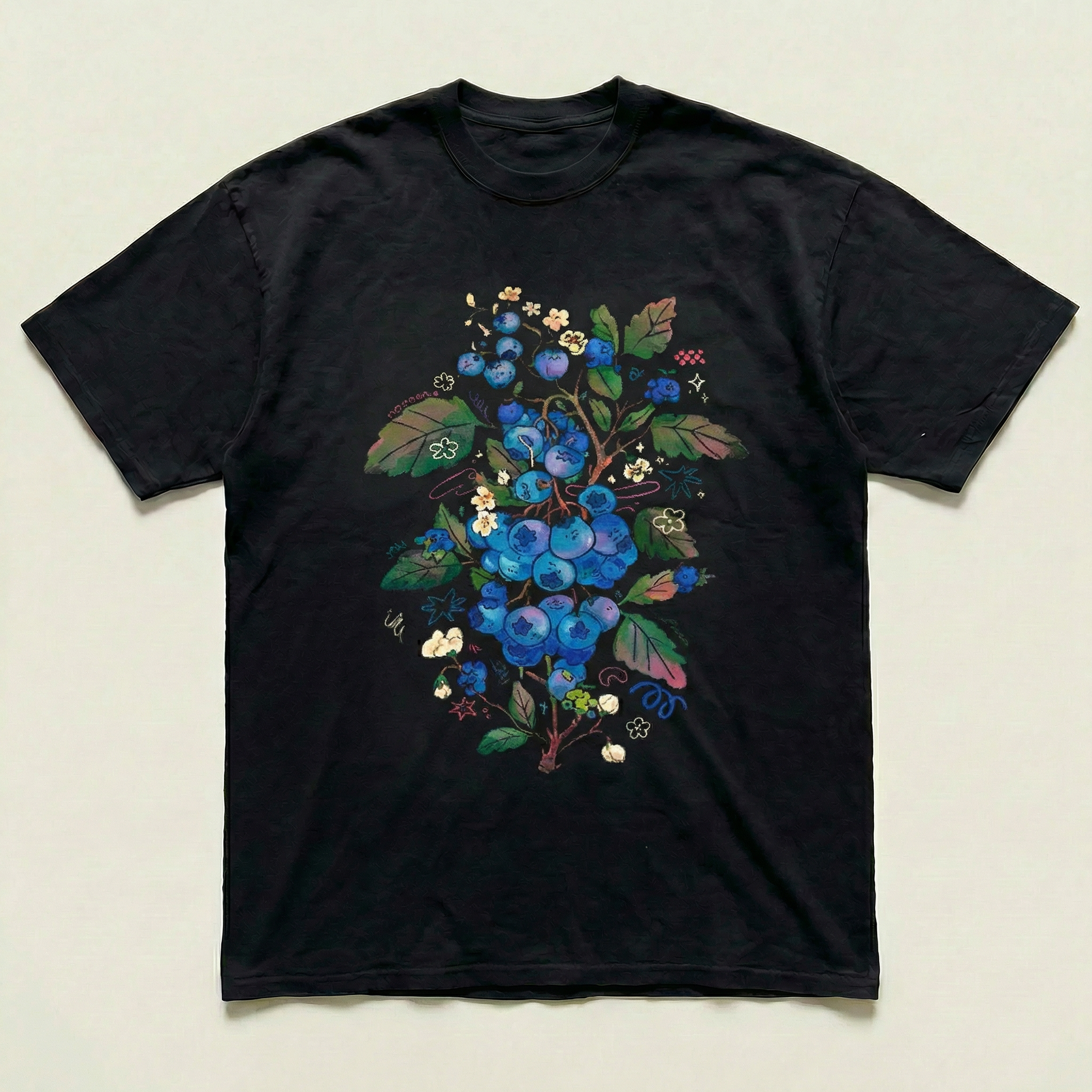 Celebrate nature's bounty with this distinctive black tee featuring an artistic blueberry tree illustration. The detailed graphic adds visual interest to a timeless silhouette, creating a piece that works as both a statement and a staple. Crafted from comfortable cotton, it's perfect for layering or wearing solo. Ideal for nature enthusiasts and anyone seeking unique, thoughtful design in their everyday collection.